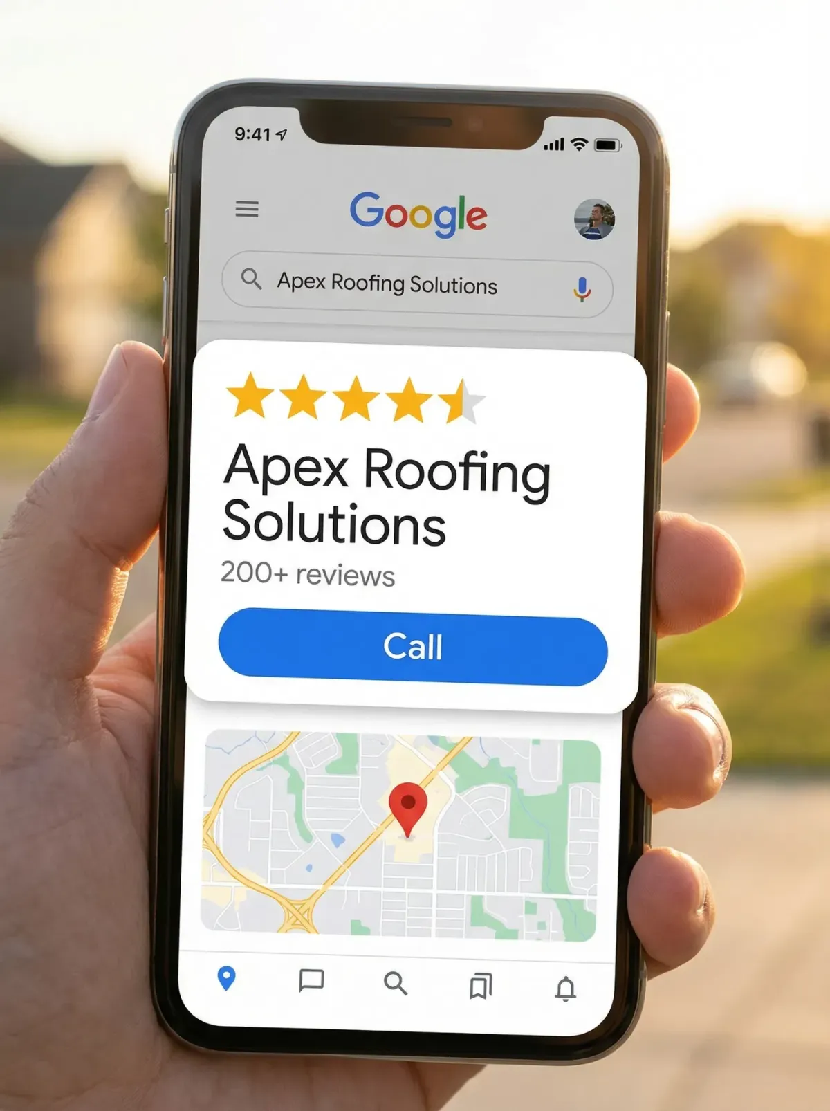 The Google Map Pack drives 44% of all local clicks. We optimize your Google Business Profile, build reviews, and manage your local presence so you show up first when homeowners search for a roofer.